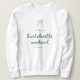 Modern Script Green Coquette Bachelorette Weekend Sweatshirt. An elegant and minimalistic bachelorette sweatshirt, designed in olive green with "bachelorette weekend" in script lettering, and a coquette bow above. Personalize with bride's name, and weekend location below.