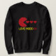 Vibrações de arcade retrô com mordida estilo Pac-Man e corações transmitidos. Texto pixelizado em vermelho ousado e amarelo neon para casais de jogadores e amantes de moda retrô.