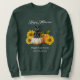 Fazenda da estação de outono, ou de casa, camisa de suor ou camiseta. Abóboras, gato preto e design de girassóis, com modelos de texto em três lugares. O design e o texto branco, com sombra preta, são mostrados em uma camisola verde-escura e escura. O texto de exemplo é "Feliz Dia das Bruxas" no topo, com o nome da fazenda, endereço e site abaixo. Escolha qualquer estilo e cor e altere ou remova o texto conforme necessário.