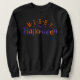 Esta na moda e trendy camiseta do Dia das Bruxas mostra as palavras "Halloween Feliz" em cores festivas roxa e laranja.