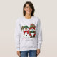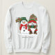 Um gnomo de Natal bonito, todo vermelho, verde e branco segurando uma caneca de chocolate quente, está ao lado de um boneco de neve com um sinal de Feliz Natal ao lado deles vestindo um cachecol vermelho e um chapéu verde escuro.