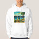 A AI criou impressão representa uma interpretação surreal dos naturistas que tomavam sol numa praia com palmeiras enquanto pequenos iates navegam no mar adjacente.