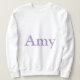 Este é um nome personalizado Amy, camisola branca para mulheres. A camisola mostrada é branca. O nome Amy está na frente da camisola em texto de cor de lavanda. O nome na frente da camisola pode ser alterado digitando um novo nome. Você pode alterar o nome para outro nome clicando no botão Personalizar. Então você pode digitar um novo nome.
