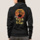 Lado traseiro: A design apresenta uma imagem cativante de um gato preto com olhos grandes e mesmerizantes saltados em um vassoura-bruxa. O felino voa graciosamente através de uma vibrante lua de cheio, acompanhada por uma trilha de morcegos ao fundo. Por baixo da vassoura, as palavras "Trick or Tratat" acrescentam um toque lúdico, enquanto uma aranha central acentua a atmosfera assustadora. Do lado oposto, o gato preto encantador é novamente representado na vassoura-bruxa, deslizando sobre a lua. Os morcegos continuam acompanhando o felino, emprestando um ar de mistério e entusiasmo. O texto "Trick or Tratat" é colocado no topo da lista, reforçando o tema do Halloween e completando a design.
