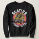 Os skatistas vão skate um trocadilho engraçado em volta de skates de roletas retrógrados.