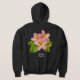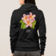 A design on front and back of the hoodie. On the front, your name is on the left pocket in sketchy white lettering. On the back, a large plumeria frangipani blossom. Pink flower with green leaves. And your name again, in matching white lettering.