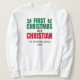 Na moda PRIMEIRO NATAL COMO UM JORNAL DE Natal CRISTÃO, COM TEXTO E DATA PERSONALIZÁVEIS. A design mostra a tipografia serif verde-natalina e vermelho-natalino com elementos vermelhos e vermelhos holly. Um "suéter de Natal feio" excelente para enviar à sua família, amigos, vizinhos e colegas de trabalho que são cristãos novos. É um presente de roupa aconchegante ideal para novos crentes que celebram o seu primeiro Natal cristão. Versão das crianças e presentes correspondentes disponíveis.