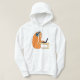 A hoodie with a cute orange monster wearing a blue headset, standing in front of a laptop on a table, typing on the keyboard. Concept of coding, programming, gaming and tech.