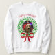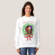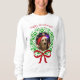 Esta camisola de férias com tema de um cão divertido apresenta um quadro fotográfico de coroa de Natal construído com estampas verdes e vermelhas com uma fotografia de um cão bonito vestindo um chapéu de Papai Noel. A legenda diz: Feliz Howlidays! Você pode deixar a foto do cachorro como ela é, ou carregar uma de suas próprias fotos.