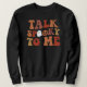 Esta camisola de pullover apresenta uma fonte colorida de queda retrógrada com as palavras "fale assustador para mim" e fantasmas e abóboras. Esta roupa de Dia das Bruxas faz a roupa perfeita de outono.