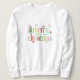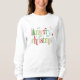 Esta camisola divertida mostra o ditado "natal alegre" com cores alternadas em letras minúsculas com sotaques brilhantes. As cores incluem rosa, vermelho, verde e azul claro.