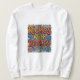 Um design vibrante apresenta a frase "Ricos com Riddles" em uma fonte divertida e arredondada. O texto está rodeado por um conjunto colorido de formas e símbolos geométricos abstrato, dispostos em um padrão simétrico. O design geral é ousado e atraente.