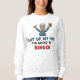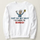 Sai do meu caminho Vou para o Bingo! Amantes do Bingo! Com uma mulher segurando um cartão de bingo e um dabber. Texto / fonte azul, preto e vermelho.