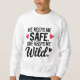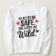 Um design divertido e sincero com o texto "Ele me mantém seguro. Ela me mantém selvagem", acentuada com dois corações vermelhos vibrantes, simbolizando amor e equilíbrio nas relações. As fontes contrastantes destacam os temas protetores e aventureiros.