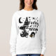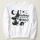 "Spellbinding Fusion: Faça uma declaração nesta temporada de Halloween em nossa incrível design de camiseta. Uma fusão de uma meia bruxa cativante, um carinhoso gato negro, e uma lua cósmica cercada por estrelas, todas colocadas contra o pano de fundo de 'Feeling a Bit Witchy'. Um presente de excelente para quem ama o Halloween, jovem ou velho.