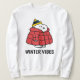 This comfortable, long-sleeve sweatshirt features the beloved Snoopy character prominently displayed. The central graphic shows Snoopy dressed warmly for cold weather in a large, puffy red winter coat and a blue and yellow knit cap. Set against a white background, this sweatshirt is a cozy and stylish apparel item, perfect for casual everyday wear, layering during the colder months, or as a fun seasonal addition to a Peanuts fan's wardrobe.