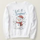 Whimsical snowbear with red Santa hat and scarf, amid pale blue snowflakes—bright, kid-friendly winter motif for holiday apparel and gifts.