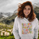 Este capuz "Melhores Coisas na Vida são Cruelmente Livres" apresenta uma citação com flores retrorreflectoras.