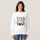 Trick Or Tratat Halloween Sweatshirt A família moderna que combina com a camisa do Halloween design apresenta o texto "Trick Or Tratat Halloween" em letras laranja e branca com um pequeno sotaque fantasma. Encomenda cada membro da sua tripulação.