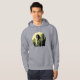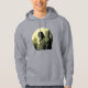 A design de camiseta retrata um gorila vestida como um humano contra o pano de fundo de uma cidade. O trabalho de arte é executado em um estilo de quadrinhos muito minimalista e tem duas cores. O gorila é mostrado vestindo camisa e calças, e a paisagem urbana no fundo é estilizada com formas e linhas simples.