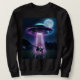 Cena misteriosa de um OVNI levantando uma vaca em um feixe de luz contra o pano de fundo de um céu noturno com uma lua de cheio. Ilustração perfeita para fãs de ficção científica, e histórias fantásticas sobre contato com civilizações extraterrestres.