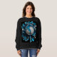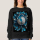 An abstract flower design composed of a large round pearl surrounded by blue and white petals covers this sweatshirt.