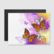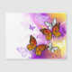 Orange, detailed monarch butterflies on light, purple, picturesque, painted background.