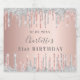 Para uma festa de aniversário de 21 anos brilhante e glamourosa. Um fundo metálico falso de rosa dourado com rosa dourado, cor-de-rosa e bobinadeiras falsas, aparência de pingar tinta. Personalize e adicione uma data, nome e idade 21. O nome é escrito em cinzas escuras com um moderno estilo escrito à mão.