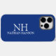 Capa de telefone moderna com um design azul simples e mínimo com seu monograma em uma fonte em negrito junto com seu nome.