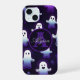 Um padrão mesmerizante com fantasmas brilhantes adoráveis em tons de roxo e branco, flutuando sobre um fundo da noite escura. O brilho etéreo acrescenta um toque mágico, perfeito para capturar o espírito lúdico do Dia das Bruxas.