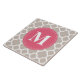 Chic, trendy, girly, padrão quatrefoil de latência marroquina em uma cinza de linho e branco com uma estrutura de rótulo de círculo geométrico cor-de-rosa com um modelo de Monograma.