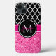 Design de monograma personalizável preto, branco e rosa quente no centro. A metade superior apresenta um padrão personalizável de girino marroquino preto e branco. Design inferior criado com uma foto brilhante na parte inferior. O design é uma foto, portanto a textura de falso brilho. Crie seu próprio caso de monograma personalizado. Tente uma fonte ou cor diferente no sistema para se adequar ao seu estilo pessoal.