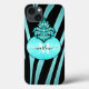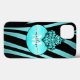 Na moda, padrão brilhante azul e preto de faixa de zebra brilhante com um elemento úmido no centro por cima de um nome e modelo de monograma.