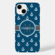 O padrão náutico das âncoras da na moda e sofisticada nave, em azul náutico e branco, com sotaques de cinza, e o emblema de coordenação para você personalizar com seu primeiro nome e seu último nome inicial. Criado por Designs Holiday Hearts para HHTrendyCase.