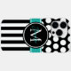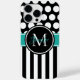 Design de monograma personalizável preto, branco e turquesa num padrão de riscas e bolinhas a preto e branco. Crie seu próprio caso de monograma personalizado. Tente uma fonte ou cor diferente no sistema para se adequar ao seu estilo pessoal.