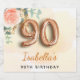Para uma festa de aniversário de aniversário elegante e feminina. Um fundo de cor d'água de ouro. Decorados com um rosa de ouro e rosa cor-de-rosa-esbranquiçada, folhas de eucalipto florais, verdes, galhos, verde e borras de ouro. Personalize e um nome. Letras pretas e ouros. O nome é escrito com um moderno estilo escrito à mão. O número 90 é gravado com uma fonte no estilo do balão de ouro.