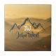 Monograma Dourado de montanhas personalizável. Montanhas desenhadas pelo vetor em cor azul de cinza com um monograma personalizável e seu nome. Ao fundo, um espantoso nascer do sol dourado com nevoeiro no vale e raios solares. presente de excelente de alguém que ama montanhas.