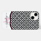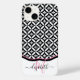 Padrão de superfície com formas clássicas de pulgas de lis atualizadas em um padrão limpo fresco aninhado em formas de harlequin e anéis de eternidade em preto sobre um fundo branco com um painel de aresta branco de baixo redimensionado com borda superior em preto e rosa. Basta adicionar seu primeiro nome e último nome para completar o design. Design de composto © 2021 Holiday Hearts Designs.