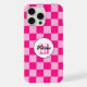 Capas de iphone de Monograma retro rosa-quente quadrados verificados. Personalize com seu nome e inicial personalizados. Legal design de padrão quadrado geométrico verificado retroralmente. Rosa claro de azulejo e verificador moderno rosa-quente.