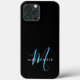 Capa de telefone de Monograma do Script Azul do Céu Negro Moderno Elegante. Um elegante monograma de script azul-céu combinado com uma fonte branca san-serif limpa faz um olhar contemporâneo.