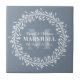 Floral Wreath Calliografia Tipografia Monograma Azulejo Cerâmico em Azul e Branco Dusty - presente de azulejo cerâmico branco e azul Na moda para recém-casados um casal que apresenta um monograma personalizado, nomes de noivas e noivos, sobrenome e modelos de data de casamento rodeados por uma coroa circular ousada. Um presente cuidadoso para uma festa de limpeza de casa ou um presente de casamento. ©edulwhimsypaperie
