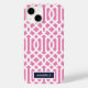 capa de telefone personalizada na moda em cores azul, rosa e branca marinho. Este design apresenta um padrão de treliças marroquino pré-disquete. Personalize-o com seu nome ou outro texto personalizado em uma fonte moderna de monograma de script. Use as ferramentas de design para escolher qualquer cor de fundo, editar as fontes e cores do texto e carregar suas próprias fotos para criar uma única de um tipo de cobrir de dispositivo!