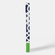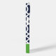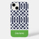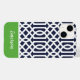 capa de telefone personalizada na moda em cores azul, verde e branco do marinho. Este design apresenta um padrão de treliças marroquino pré-disquete. Personalize-o com seu nome ou outro texto personalizado em uma fonte moderna de monograma de script. Use as ferramentas de design para escolher qualquer cor de fundo, editar as fontes e cores do texto e carregar suas próprias fotos para criar uma única de um tipo de cobrir de dispositivo!