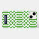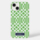 capa de telefone personalizada na moda em cores azul, verde e branco do marinho. Este design apresenta um padrão de treliças marroquino pré-disquete. Personalize-o com seu nome ou outro texto personalizado em uma fonte moderna de monograma de script. Use as ferramentas de design para escolher qualquer cor de fundo, editar as fontes e cores do texto e carregar suas próprias fotos para criar uma única de um tipo de cobrir de dispositivo!