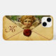 Design elegante, clássico e clássico com cupido amoroso, selo de cera vermelha, coração e flecha num pergaminho castanho antigo adequado para noivados românticos, casamentos, natal, feriados, uso familiar ou profissional.