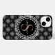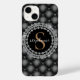 Ouros Negros Elegantes Mala Dourada Monograma Cascata iPhone 14. Design ultra-luxuosa com design de fundo tufado a preto. A design inclui um monograma personalizável e um nome rodeado por belos diamantes brilhantes. Excelente de pôr a tua bola!