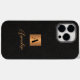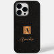 Monograma na moda elegante e capas de iphone personalizada com script de assinatura, apresentando um quadrado de cobre dourado metálico falso com iniciais de nome sobre um fundo de couro preto como (IMPRESSÃO TEXTURA).