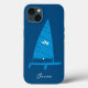 Este simples e na moda é personalizado com seu nome e suas iniciais de monograma. Uma ilustração do estilo gráfico do barco à vela, incluindo as suas iniciais monográficas na vela e o seu nome numa letra escrita à mão. Cores de capas de iphone: marinho escuro, azul e branco.