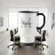 Nome personalizado, tipografia, monograma de café para caneca de viagem. Monogramas de safra com letras na moda. Bela ideia de presente de aniversário personalizado ou de casamento para homens e mulheres (dele e dela). Na moda com elegantes cores preto e branco. Disponível como uma grande caneca gigante grande e grande e grande para viajar. Design de dois lados.