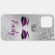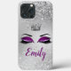 A Capa de telefone Real Purple Glitter Eyes Monogramas apresenta uma Coroa da Rainha Prateada e um par de tampas oculares com a púrpura da púrpura da pálpebra, um revestimento de efeito diamanté com longas lascas pretas sobre um fundo de efeito brilhante prateado. Personalize com o nome de sua escolha em correspondência com o Royal Purple. Concebido por Jacqueline. Personalizado por você.
